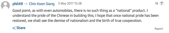 phil49回复Chin Koon Siang:说的不错!即使汽车制造行业也很难说什么是“国产”的了。我理解中国人在C919里面的民族自豪感,我希望日后民族自豪感得以恢复之后,民族主义情绪降温,那时才是真正合作的开始。