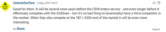 UnevenSurface:干得不错。还需要几年C919才能正式交付,甚至需要更长时间才能真正与空客A320NEO展开竞争,不过能有第三家飞机制造商加入竞争终归是好事情。当中国人的飞机能与波音787和空客A350竞争的时候,局面就更有趣了。