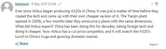 karpouzi:自打空客在中国生产A320起,中国人通过复制我们的技术,造出更便宜的客机就只是个时间问题。2008年天津组装工厂投入生产,仅仅几个月后中国人就宣布开始研制与A320类似的机型。空客公司在想什么?中国人已经用这种手段几十年了,拿走外国技术,然后把产品做得更便宜。现在这个新的竞争者会在价格方面给空客很大压力,在中国已经非常巨大而且还在不断增长的国内航空市场上,空客A320的市场份额将被他们抢走一大块。