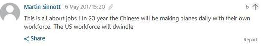 Martin Sinnott:这件事跟就业关系很大!不出20年,中国可以每天用自己的工人制造飞机,美国相关的就业岗位会大大减少。