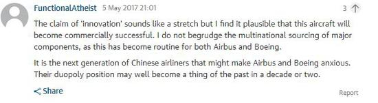 FunctinoalAtheist:如果中国人说这架飞机是“创新成果”,那他们的确是夸张了点,不过我觉得这架飞机在商业上很可能会取得成功。我并不认为飞机的分系统外包给世界各国分包商有什么不妥,空客和波音也是这么做的,这就是行业规矩。不过C919的下一个型号可能会让空客和波音有些紧张了,十几二十年后,目前这种双寡头垄断的大飞机制造格局很可能会被打破。