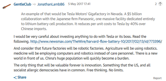 GentleClub回复JonathanLamb86:我会留意与特斯拉或它的老板有关的任何投资信息。说到未来的工厂形态,那将是智能工厂。农业领域也会使用机器人。机器人和计算机将取代工人。我们未来的是一个新世界,中国庞大的人口很快将成为负担。唯一永远有价值的就是创新,创新正是美国以及所有反社会主义的民主国家的共同特质。思想自由,毫无限制。