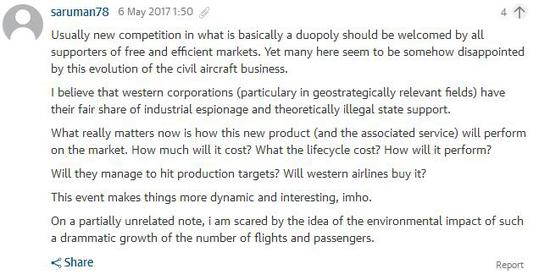 saruman78:通常在一个双寡头垄断市场上,有新的竞争者加入是受到那些拥抱自由主义市场观点人士欢迎的。不过我从很多评论里却感到人们对中国民用航空制造业的这一进步颇为失望懊恼。我相信,西方公司(尤其是那些与地缘战略关系密切的公司)都有自己的工业间谍,他们甚至在国家层面也获得了非法的协助。现在重要的问题是,中国的这个新产品和售后服务在市场上表现如何?售价如何?全生命周期的运营成本如何?飞机本身的乘坐体验如何?中国人会达成自己的生产目标吗?西方航空公司会买吗?这些问题是充满悬念的,而且更加有趣。我说一句不相干的话,乘飞机的人越来越多,如此多的飞行活动将对地球环境造成很大影响,想起这一点我就感到担心。