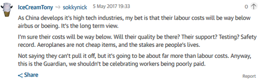 IceCreamTony回复sokkynick:从长期来看,中国发展自己的高科技产业时,劳动力成本将低于空客或波音。我肯定他们的成本会低得多,可飞机的质量呢?维护呢?测试呢?飞机的安全记录呢?飞机毕竟不是廉价商品,人命关天。我不是说他们做不到上面说的那些,我的意思是飞机制造不仅是劳动力成本低就可以取得优势的,没有那么简单。我知道这里是《卫报》,不能在这里因为工人工资低而感到高兴。