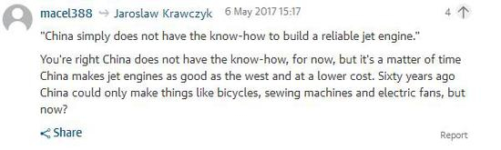 macel388回复Jaroslaw Krawczyk:“中国根本不知道如何生产可靠的喷气式发动机”——你说中国不知如何生产发动机,你的话现在是正确的,不过中国生产出与西方一样质量的发动机也只是时间问题,而且他们还能以更低成本生产。60年前,中国只能生产自行车、缝纫机和电风扇,现在呢?