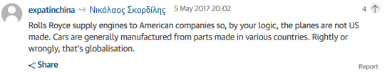 expatinchina回复Νικόλαος Σκορδίλης:美国飞机用的是英国罗尔斯罗伊斯的发动机,按照你的逻辑,波音飞机也不是美国造的了。汽车上的零部件也来自多个国家,无论怎样,现在是全球化时代了。