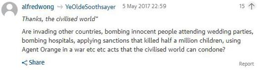 alfredwong回复YeOldSoothsayer:“谢谢!——来自文明世界的留言”。侵略其他国家,轰炸参加婚礼的无辜平民,轰炸医院,制裁某个国家导致50万人死亡,在战争中使用化学武器……这是文明世界能原谅的吗?