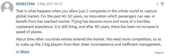 ID853744:全球市场被两家公司分食就是现在这种局面。在过去四五十年里,航空市场上,没有乘客可以看得见的或者可以从中获益的创新成果出现。飞行体验越来越糟糕,坐飞机仍然非常让人疲劳,六十年了,飞行速度也没有大的进步。是时候有其他国家加入进来了,我们需要竞争,让波音和空客这两家公司从无能低效的管理中惊醒过来。