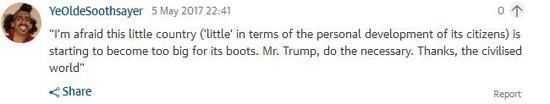 YeOldSoothsayer:“我觉得这个小国家(我说‘小’指的是该国公民的个人成长而言)已经长得太快了,原来的鞋都穿不下了。特朗普先生,快采取必要措施。谢谢!——来自文明世界的留言”