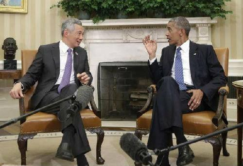 2016年8月,新加坡总理李显龙访美,与奥巴马在白宫办公室交谈。