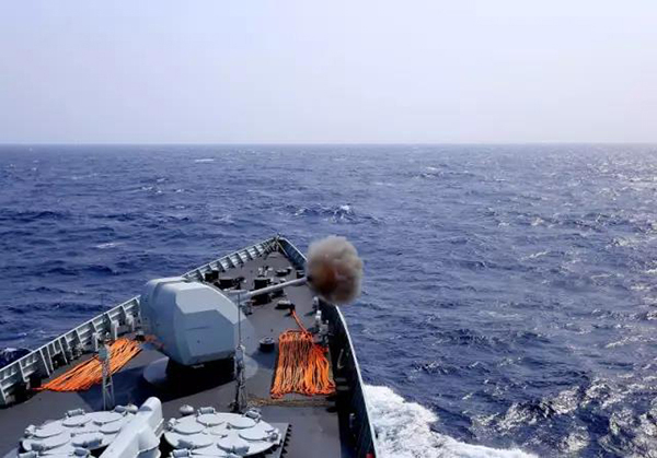 编队进入射击海域,导弹驱逐舰长春舰立即锁定目标,100毫米主炮进行对海实弹射击,试射2发后又连续2次进行3发的效力射,弹着密集覆盖靶标,浮体靶漏气开始变小。之后,导弹护卫舰荆州舰单76毫米主炮进行实弹射击,发射32发炮弹,将浮体靶直接击沉。与此同时,巢湖舰副炮对浮雷模型靶进行实弹射击。