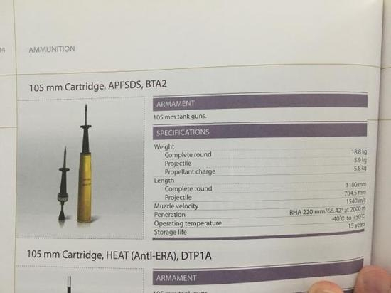 2012年北方工业公司外销产品手册,105毫米BTA2型穿甲弹,在2000米距离能击穿66.42度的220毫米均质钢装甲