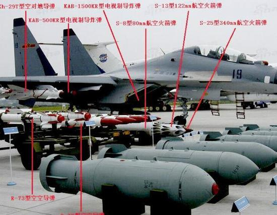 根据公开报道,苏-30MK2的最大载弹量为8吨,不过也有消息称其极限载弹量为9.4吨,除了可以挂载各类俄制空空导弹之外,还可以挂载各类非制导炸弹和火箭弹,当然,作为一款经典战斗轰炸机,其最主要的还是发射各类俄制制导武器,除了各类制造炸弹之外,还包括KH-59/31/29系列空地导弹。