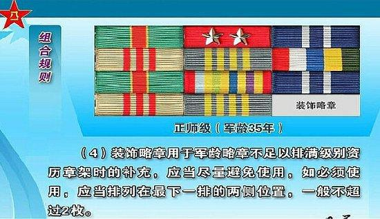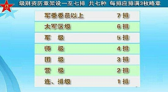 级别资历章架由资历章架的排数确定级别,每排应当排满3枚略章。军委委员以上7排,大军区级6排,军级5排,师级4排,团级3排,营级2排,连、排级1排。