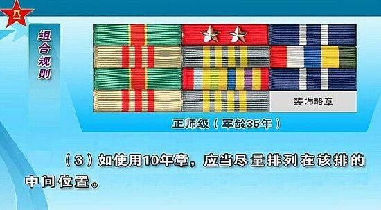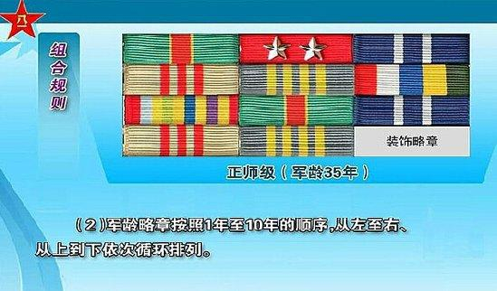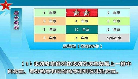 级别资历章组合规则(1)级别略章应当排列在级别资历章架最上一排中间位置,军龄略章和补充略章排列在其他位置。(2)军龄略章按照1年至10年的顺序,在级别资历章架上从左至右、从上到下依次循环排列。(3)如使用10年军龄略章,应当尽量排列在该排的中间位置。(4)补充略章用于军龄略章不足以排满级别资历章架时的补充,应当尽量避免使用,如必须使用,应当排列在最下一排的两侧位置,一般不得超过2枚。(5)如果军龄略章采用上述方式不足以排满级别资历章架,应当减少4年以上高年限军龄略章的使用,改用3年以下低年限军龄略章进行循环排列,直到排满级别资历章架为止。