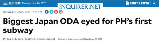 “日本最大的ODA贷款盯上菲律宾首条地铁”,截图来自菲律宾《每日问询者报》
