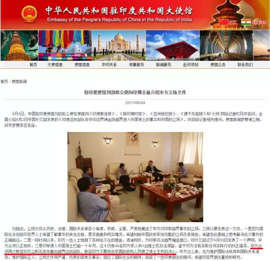 据中国驻印度大使馆官网8月4日凌晨消息,8月3日,中国驻印度使馆刘劲松公使对使馆向《印度教徒报》、《新印度时报》等印度媒体介绍了我国外交部8月2日发表的《印度边防部队在中印边界锡金段越界进入中国领土的事实和中国的立场》文件。