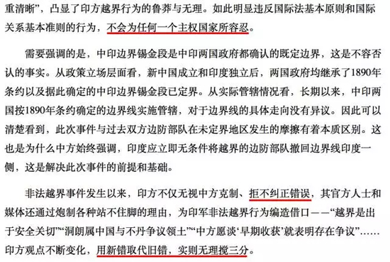 文中指出,印军不论多少人员非法越界并滞留在中国境内,其性质都是对中国领土主权的严重侵犯,严重违反《联合国宪章》,构成国际不法行为,印方应为此承担相应的责任。并连续四次强调印方的行为“绝不是为了和平”。