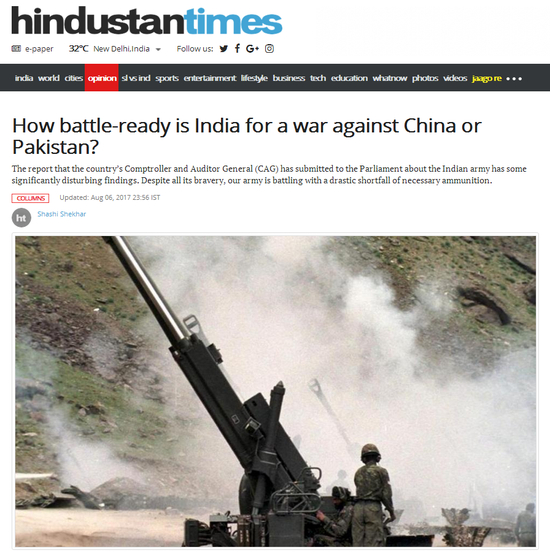 《印度斯坦时报》8月6日报道截图[环球网综合报道]“如果与中国或巴基斯坦爆发战争,印度为战争准备好了吗?”《印度斯坦时报》8月6日以此为题称,印度审计总署(CAG)向议会提交的一份关于印度军队的报告,有一些明显令人不安的发现:在战斗时印度军队面临严重的弹药不足的情况。