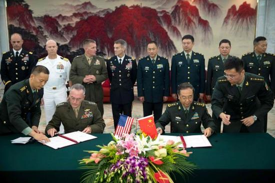 据美国国防部网站8月15日报道,15日,美国参谋长联席会议主席约瑟夫·邓福德上将和中国中央军委委员、军委联合参谋部参谋长房峰辉上将签署了《中美两军联合参谋部对话机制框架文件》。邓福德正在中国访问,目的是推进这两个太平洋大国军方之间的联系。