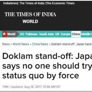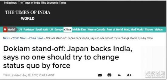 文内标题“洞朗僵持:日本支持印度,任何人都不应该试图以武力改变现状。”(图:印度时报)