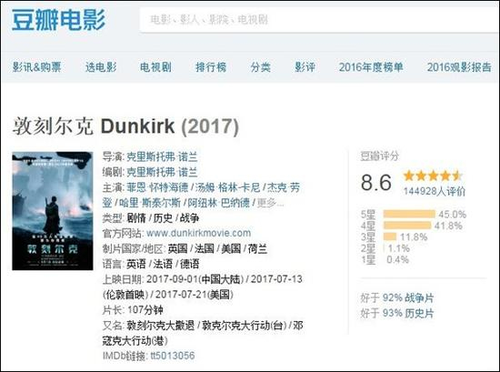 (豆瓣电影截图)中国是一个快速发展且思想活跃自由的社会,老百姓对每一件事情都会发出不同的声音和观点。有一些人很喜欢《敦刻尔克》,自然也有一些人很不喜欢《敦刻尔克》。