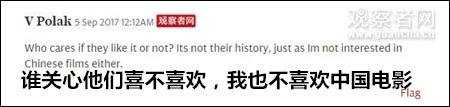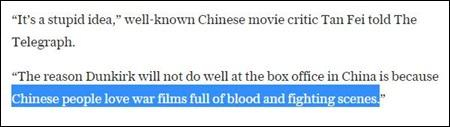 (印度裔英国历史学家Rana Mitter)文章结尾,拉出了一个中国人来最后把中国人的审美黑了一遍。《电讯报》引用影评人谭飞的话说,把《敦刻尔克》和《战狼2》做对比是愚蠢的想法。《敦刻尔克》不会取得票房胜利的原因是中国人看战争片就喜欢打打杀杀的血腥场面。