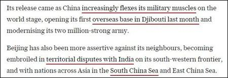 同时文章还将《战狼2》的上映和中国的强军目标生拉硬扯到一起,称这是中国在向世界喊话的行为。并且把中国在南海和中印边境维护领土主权的正义之举形容为炫耀武力。