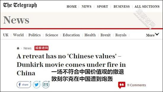 (《电讯报》评论截图)从部分中国民众抵制《敦刻尔克》可以一路上升到全部中国人喜欢打打杀杀,《电讯报》混淆视听,颠倒黑白的能力真的让人叹为观止呢……
