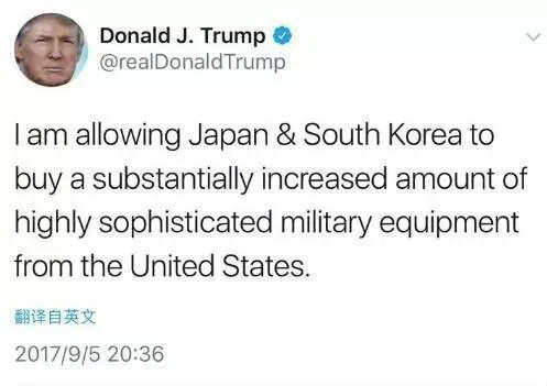 特朗普9月5日还在推特上写着:“我同意日本和韩国从美国购买大量精良装备的军事武器。”而对“美国动武”一说,只字不提。
