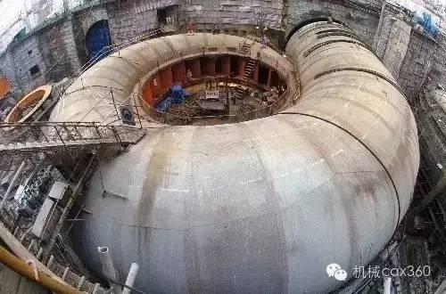 2005年12月7日,三峡右岸电站吊装完成的一台机组蜗壳,与大坝引水管相连,蜗壳中间是座环固定导叶 图片来源见水印