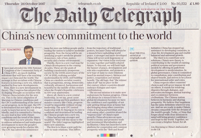 中新网伦敦10月26日消息,26日出版发行的英国主流报纸《每日电讯》整版刊发中国驻英国大使刘晓明的署名文章《为中国领航,为世界担当》,该报网络版也同时播发此文。