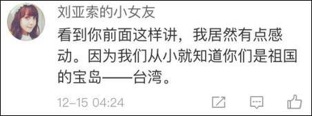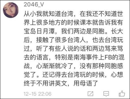 她对台湾人说:“不管你拥有怎样的政治立场,我都非常反对你们乱骂大陆人。因为他们的课本教育他们,台湾人是他们的同胞。他们对我们台湾人是很友善的,你们不应该因为自己私人的情绪,乱撕乱骂大陆人。”