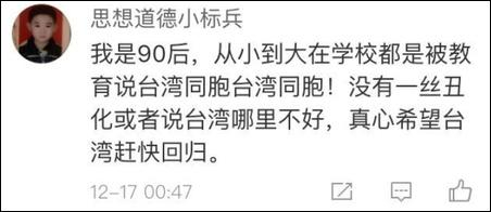 大陆网友表示,这段视频看哭了:我们确实从小就知道,台湾是祖国的宝岛,岛上的人是我们的同胞,我们的教材从来没有一丝丑化台湾。希望两岸人民能多多交流,减少隔阂。