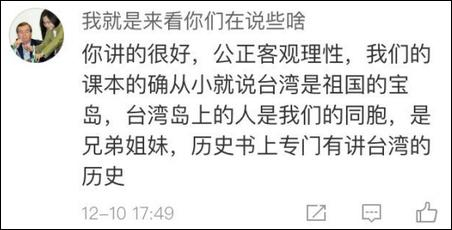 她说,大陆的小学课本教育大陆的孩子,台湾是祖国的宝岛,台湾人是大陆人的同胞,“他们对台湾非常友善,台湾人不应该因为乱骂大陆人。”