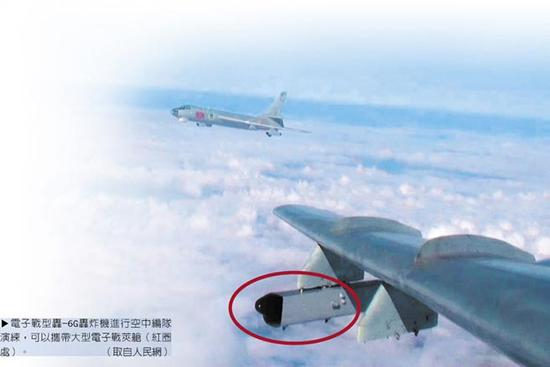 电子战型轰-6G轰炸机进行空中编队演练,可以携带大型电子战荚舱(红圈处)。(台媒配图)