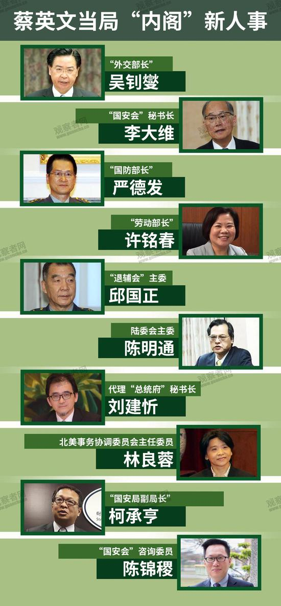 据台湾《联合报》报道,据悉,这次“内阁”改组过程相当仓促,几乎到昨天公布前才拍板。“总统府”春节初五开始召集“府内”高层讨论新人事,“国安”高层几乎初四才接获通知,准备开会。