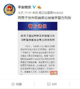 通报中称,3 月8 日,南京警方先后接群众举报两起网络滋事违法犯罪警情:微信名“ 圣诞老人” 的网民在微信群中发布涉及南京大屠杀的极端言论,昵称“ 落落” 的网民在QQ 群中煽动以驾车冲撞行凶等极端方式制造事端。南京警方对上述两起警情高度重视,在安徽安庆、池州和江苏省扬州警方的大力协助下,经连续工作,将嫌疑人王某、洪某抓获并刑事拘留。