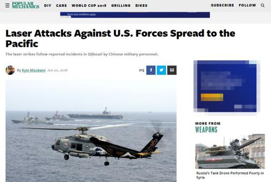 继5月份美媒炒作中国在吉布提进行“激光武器攻击事件”后,20日,又有美国媒体报道称,中国“针对美国军队的激光攻击”已经从非洲扩散到太平洋了。