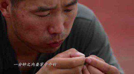 陈明:比如说观察,我们狙击手平时拿根针,看这个针眼,一直盯着看,有时候半个小时目不转睛。时间长了,我现在看针眼,比别人看的要大。平时我在训练自己的时候,百米冲刺回来之后,心跳数量达到了170,这个心跳人的呼吸很急促,这个急促的过程还要快速地穿针,一分钟内要穿十根针。通过这样的训练要求,强行平复自己的呼吸。