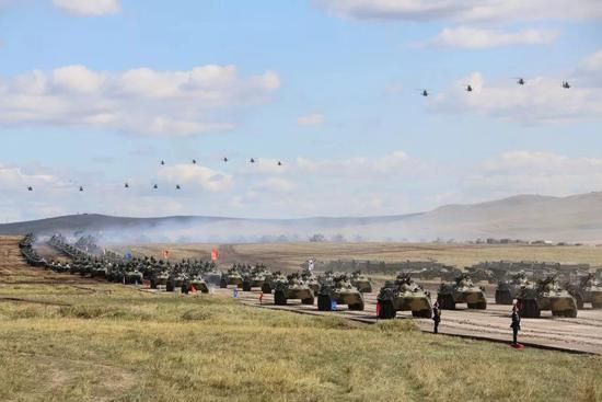 金秋的楚戈尔训练场天高云淡。当地时间9月13日12时许,伴随着直升机编队由远而近的轰鸣声,空降突击分队开始机动防御部署,正式拉开实兵实弹演练的序幕。
