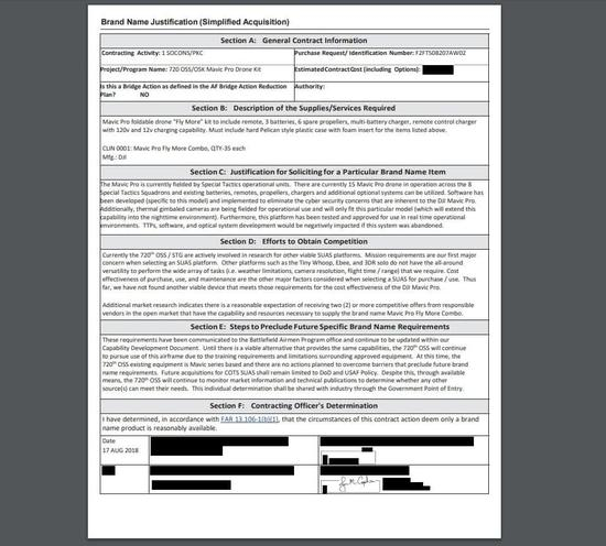 文件称:“到目前为止,美国空军还没有找到另一种可行的设备来满足DJI Mavic Pro无人机带来的成本效益要求。”