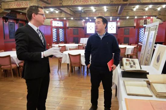克虏伯基金会历史档案学者丹尼尔·德罗斯特(左)在德国埃森市郊许格尔庄园主楼内的“中国厅”接受采访。(新华社记者连振摄)