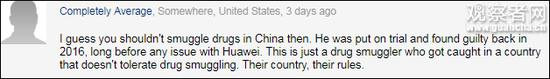 确实,加拿大、美国政府不尊重中国法律,反而凸显了不少国外网友的明事理。一名美国网友评论道,“这就是一个毒品走私犯在一个不允许毒品走私的国家被抓了。他们的国家有自己的规则。”