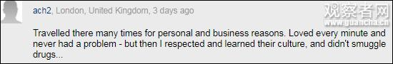 加拿大外交部近日还更新了对其公民前往中国旅行的建议,有英国网友则用自己的经历,点明了中国行为“威胁到各国”一说的实质,他说:“我因为个人和工作原因去过很多次。爱那里的每一分钟,我也没碰到任何问题——不过我尊重、学习了他们的文化,也没走私毒品。”