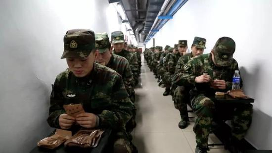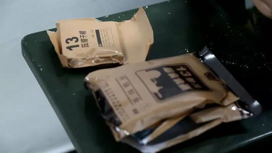 午餐时间到,原先开展体能训练的通道,现在变成了餐厅,这一袋压缩干粮,就是一个人一整天的口粮。