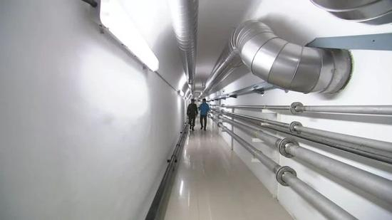 这个地下坑道呢,上下相连左右相通,有很多的区域,和我们小时候钻的那个山洞呢很相似,但是不同的呢,是多了很多这些现代化的通风的管道呀、电路啊管线系统,再往前面走呢,是红色区域,是不允许我们这次采访进入的区域。绿色区域呢,可以进行采访,下面呢,我们就到生活区先来看看。