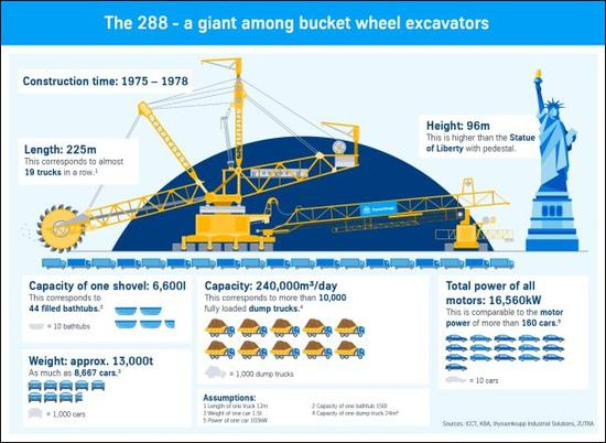 从体型上来看,Bagger 288是不折不扣的“巨无霸”:高96米,比自由女神像还要高;臂展225米,相当于19辆卡车连在一起;重达12840吨,需要12条履带助其前进,最高速度下Bagger每分钟只能走10米。