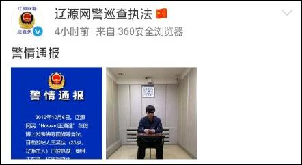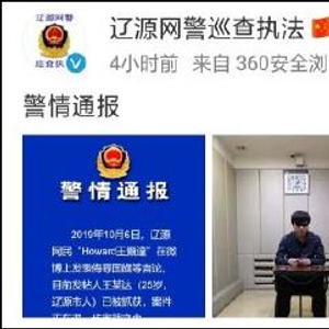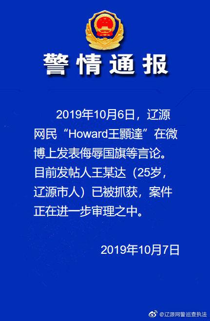 10月7日凌晨2点,吉林@辽源网警巡查执法 发布警情通报:2019年10月6日,辽源网民“Howard王顥達”在微博上发表侮辱国旗等言论。目前发帖人王某达(25岁,辽源市人)已被抓获,案件正在进一步审理中。