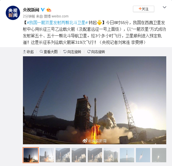 [#我国一箭双星发射两颗北斗卫星# 转起[威武]]今日8时55分,我国在西昌卫星发射中心用长征三号乙运载火箭(及配套远征一号上面级),以“一箭双星”方式成功发射第五十、五十一颗北斗导航卫星。经3个多小时飞行,卫星顺利进入预定轨道!这是长征系列运载火箭第319次飞行!(央视记者刘常连 李雯婷)